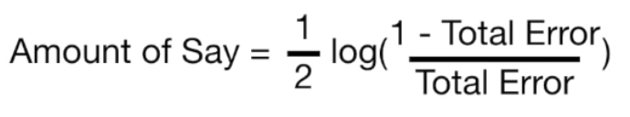 Amount of Say 를 그래프화 하면 아래와 같다. Total Eror 가 0에 가까울 수록 Amount of Say는 무한대에 수렴하고, 1에 가까울 수록 - 무한대에 수렴한다. 물론 그런 극단의 상황은 피하기 위해서 실제 application단에서는 보정을 위해 작은 error term 을 추가하여 사용한다.