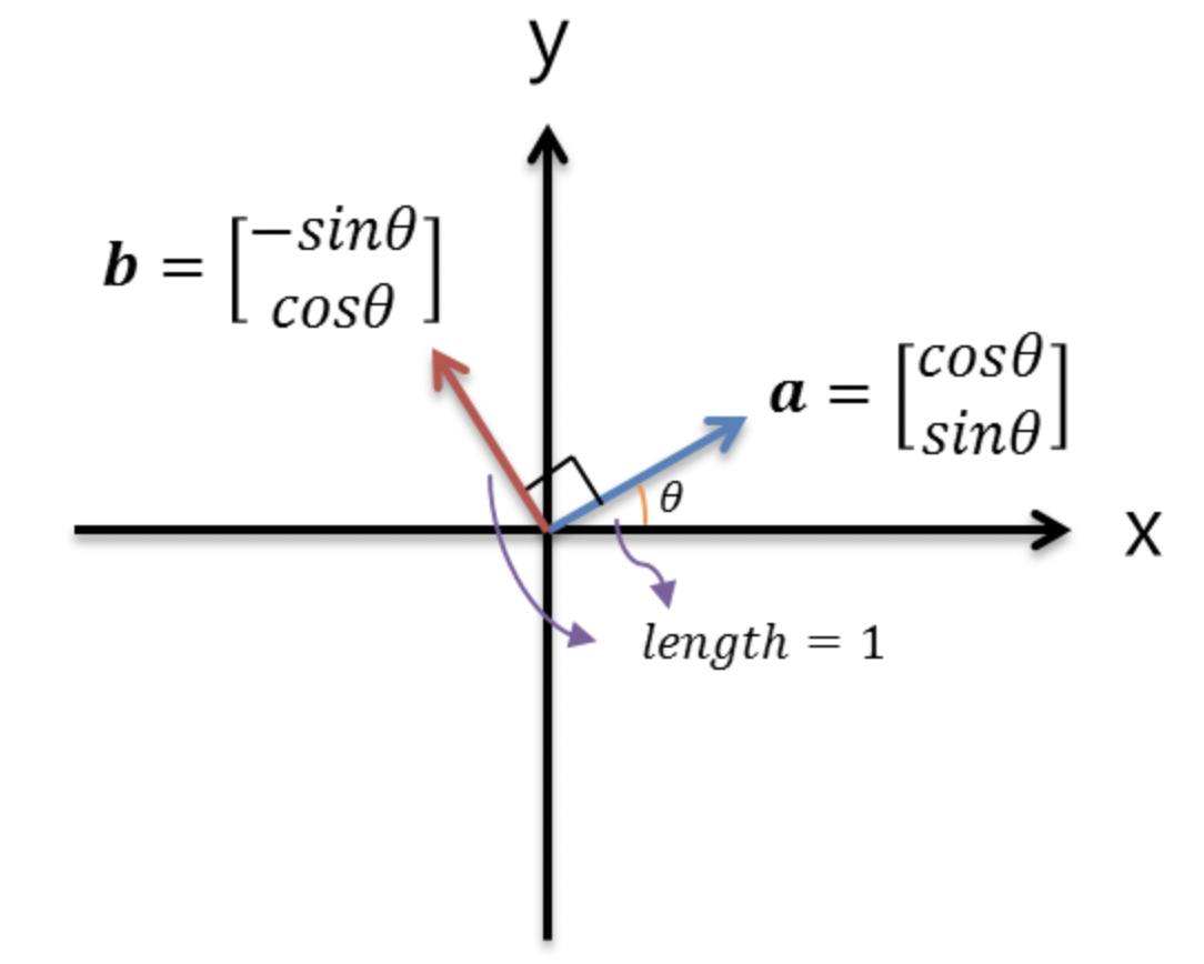 sin과 cos 으로 이루어진 벡터를 나타낸다. 이들 벡터 a,b의 길이는 각각 1이며 둘 사이의 각도는 90도 이다. 두 벡터가 직교하며 각 벡터의 길이는 1로써 방향성분만 나타내므로 이들은 정규직교벡터이다.