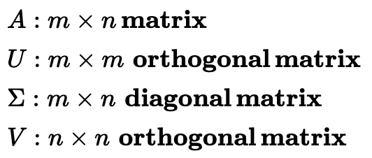 특이값 분해(Singular Value Decomposition, SVD)는 임의로 $m /times n$ 차원의 행렬 $A$에 대하여 다음과 같이 행렬을 분해할 수 있다는 '행렬 분해' 방법 중 하나이다.