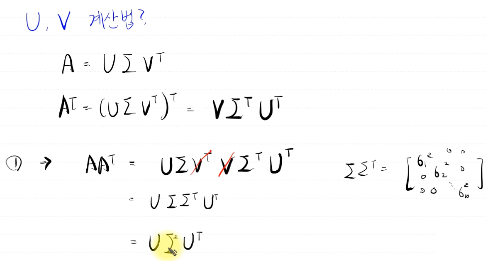 U, V 계산법은 eigenvalue decomposition 이라는 기법을 이용해야 한다. 추후 정리하자.