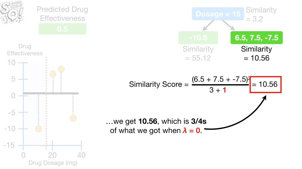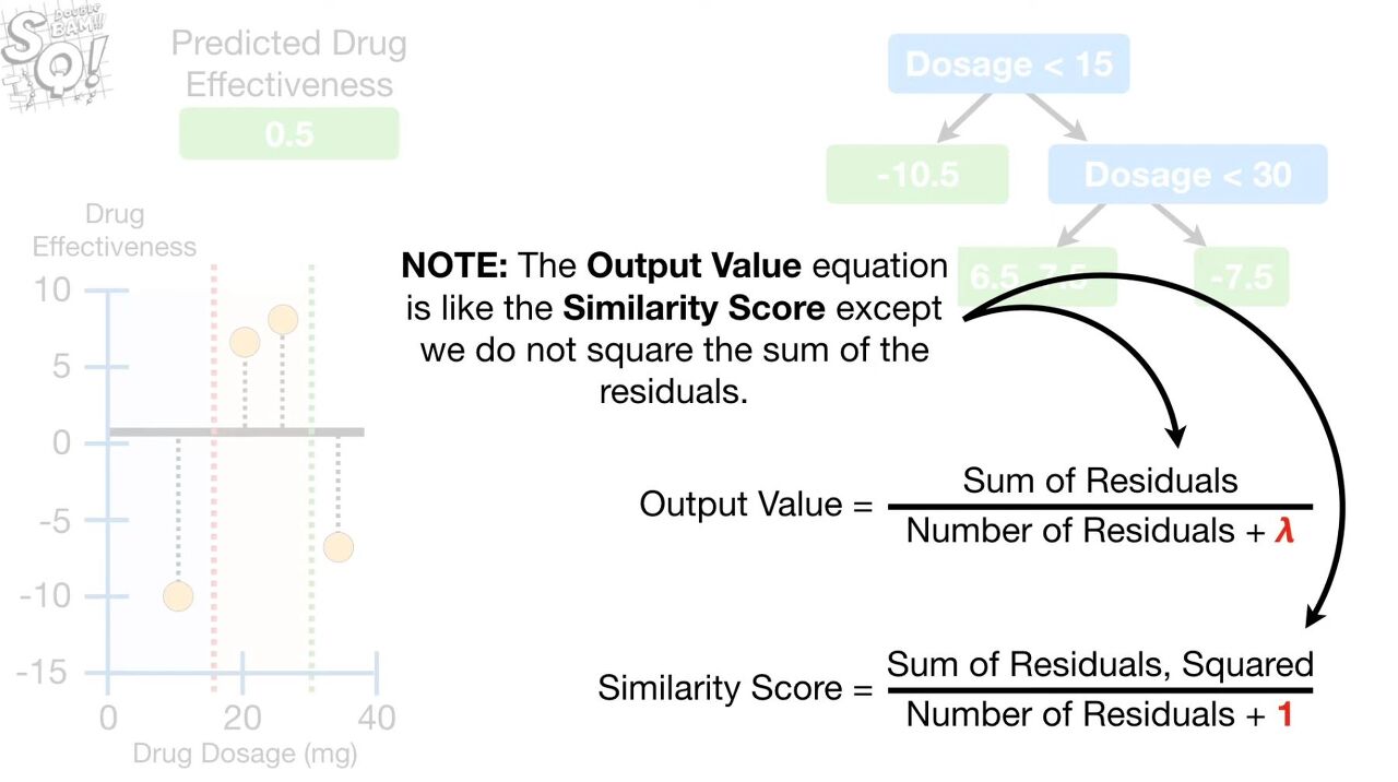 Similiarity Score은 square of sum of residuals 이 아니라 sum of residual의 sqaure 값이다. 그리고 lambda 는 regularization term이다.