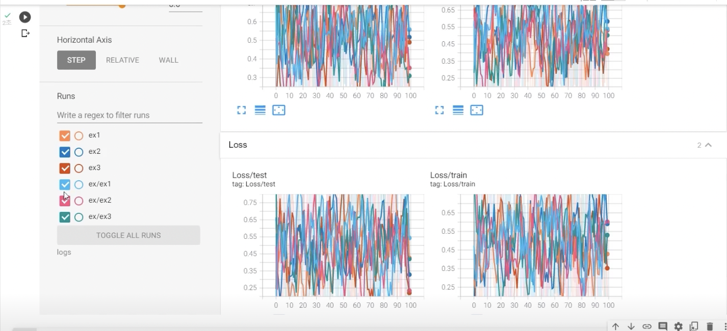 폴더 명을 돌릴 때 마다 다르게 저장 하고 나면, 다음과 같이 tensorboard에 반영되어서, 각 실험을 비교해보며 볼 수 있다.
