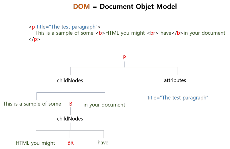 DOM은 tree 구조의 형태를 가지고 있다. DOM 에 포함 된 <p>를 더 자세히 살펴보자. <p> 태그도 트리형태의 구조를 형성하고 있다. DOM 객체에 접근하고 또 키워드로 필요한 노드에 접근하여 목표한 작업을 할 수 있다.