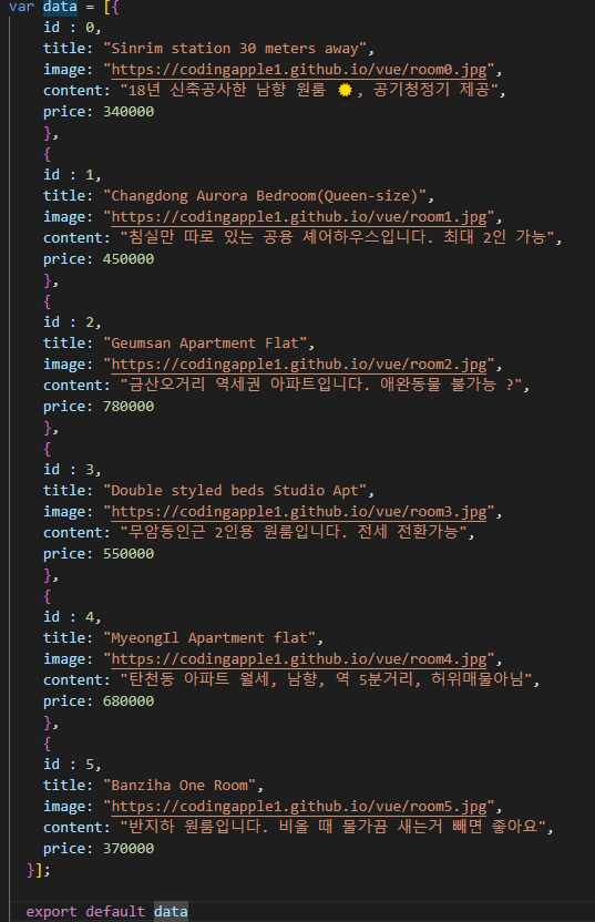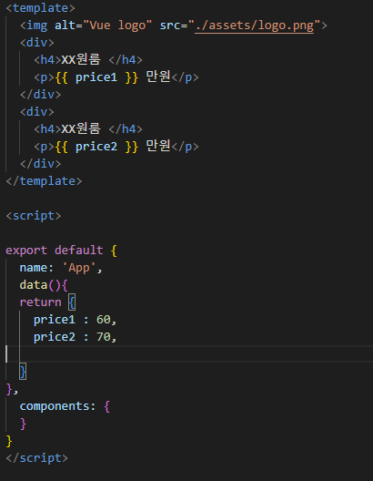 data() 안에 object 형식으로 데이터를 저장하고, html 안에 JS 데이터를 꽂아 넣었다.