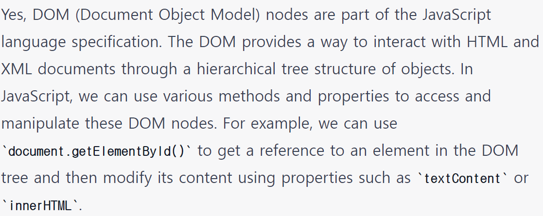 JavaScript는 이 메소드를 사용해 웹 페이지의 텍스트를 동적으로 변경할 수 있다. 이처럼 DOM은 JavaScript가 HTML을 '이해'하고 조작할 수 있게 만드는 통역사 같은 역할을 한다. 즉, '객체'라는 형태로 변환된 HTML 태그 (문서 객체)는 JavaScript의 문법으로 조작이 가능하게 된다. JavaScript는 이 문서 객체를 통해 웹 페이지에 동적인 기능을 추가하거나 사용자의 상호작용에 반응하는 등의 작업을 수행할 수 있다.