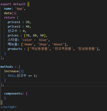 <button v-on:click= "increase">허위매물신고</button> <span>신고수 : {{신고수}} </span>