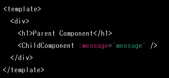 ChildComponent tag 를 갖는 Parent Component, message 를 ChildComponet에 pass down 한다.