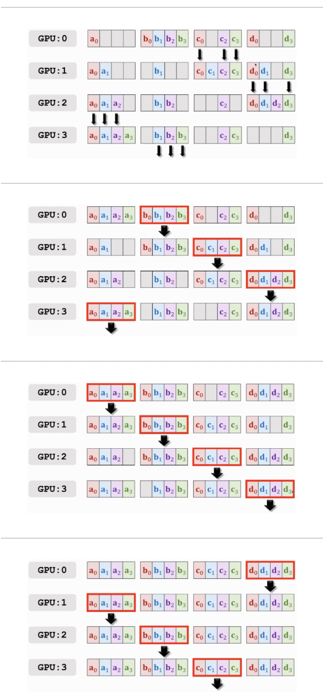 3) 각각의 GPU는 분리된 Gradient의 일부를 옆 GPU 에게 전달