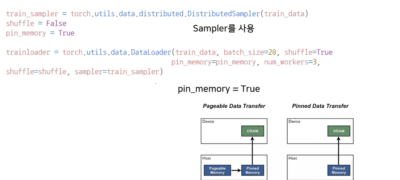 즉, pinned memory는 위 그림처럼 GPU에서 호스트에서 디바이스로 전송을 위한 staging area이고 pinned data transfer는 pinned memory와 pageable memory의 전송 비용을 줄이기 위해 데이터를 pin memory에 고정시켜 전송하는 방법이다. 우리가 pin_memory = True로 하게된다면 입력 데이터를 바로 pinned memory에 로드하여 빠르게 데이터 복사를 해 CUDA 연산을 효율적으로 할 수 있게 해준다. 따라서 시스템 메모리가 넉넉하다면 pin_memory = True로 하고 학습을 수행한다면 병목을 개선시킬 수 있다.
