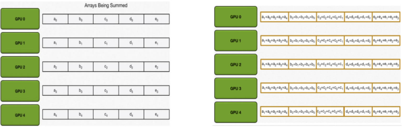 위 사진을 참고하면, Start 그림 GPU0 a0 + b0 + c0 + d0 + e0 은, GPU0 에서 계산된 Gradient 를 의미
