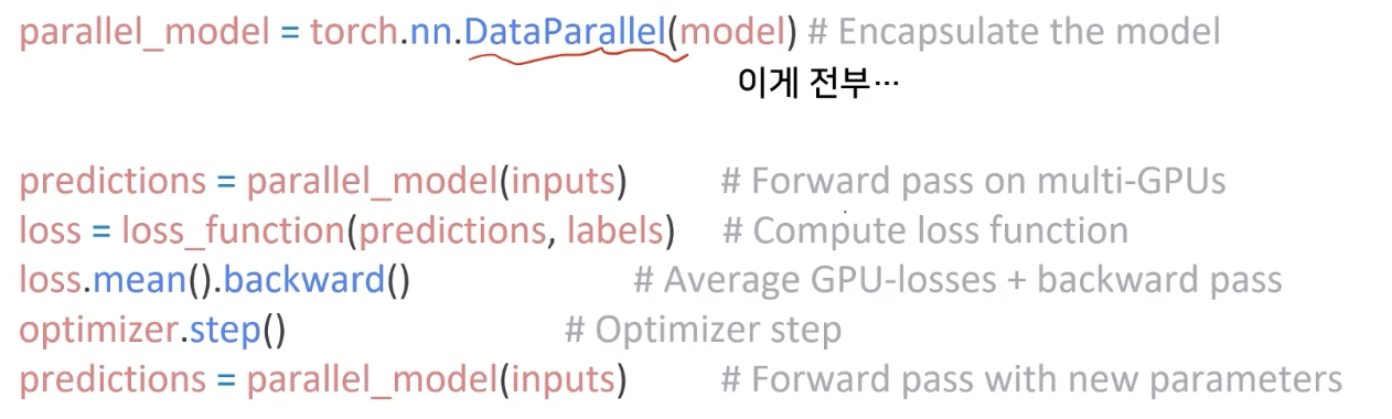 DataParallel은 단순히 데이터를 분배한 후 평균을 취한다.