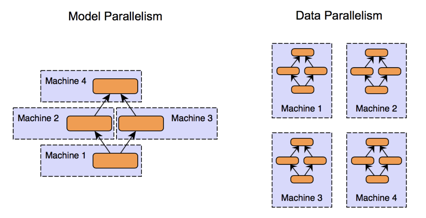 예를 들어보자. 모델 병렬화를 하면, 10개의 층으로 구성된 m 신경망 모델에 대해서 데이터 병렬 처리 방법은 10개의 층을 전부 복제하여 각 GPU에 할당하여 처리하지만, 이와 반대로 2개의 GPU에 모델을 병렬 처리한다면, 각 GPU에 5개의 층씩 각각 할당하여 호스팅할 수 있다.