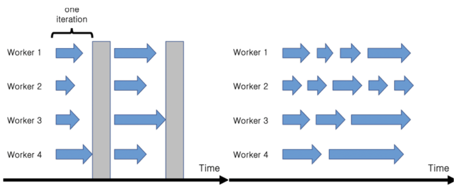 각 Worker는 파라미터 서버 노드에게 파라미터를 받아 자신의 파라미터를 업데이트 후 다음 학습 진행