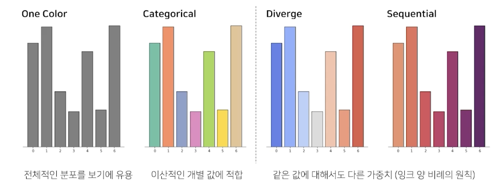 연속적인 색상을 사용하여 값을 표현 : 어두운 배경에서는 밝은 색, 밝은 배경에서는 어두운 색이 큰 값을 표현