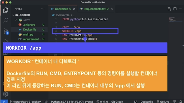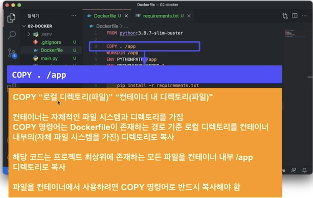 현재 폴더에 있는 모든 것들을 컨테이너 내부의 ./app 으로 옮겨오겠다는 뜻 즉 copy