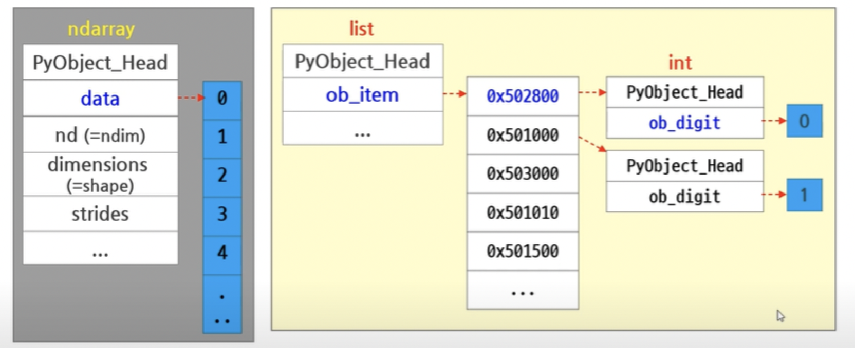 --> 정확히 numpy가 list보다 더 빠른 이유는 다음과 같다. (https://checkwhoiam.tistory.com/94 참고)