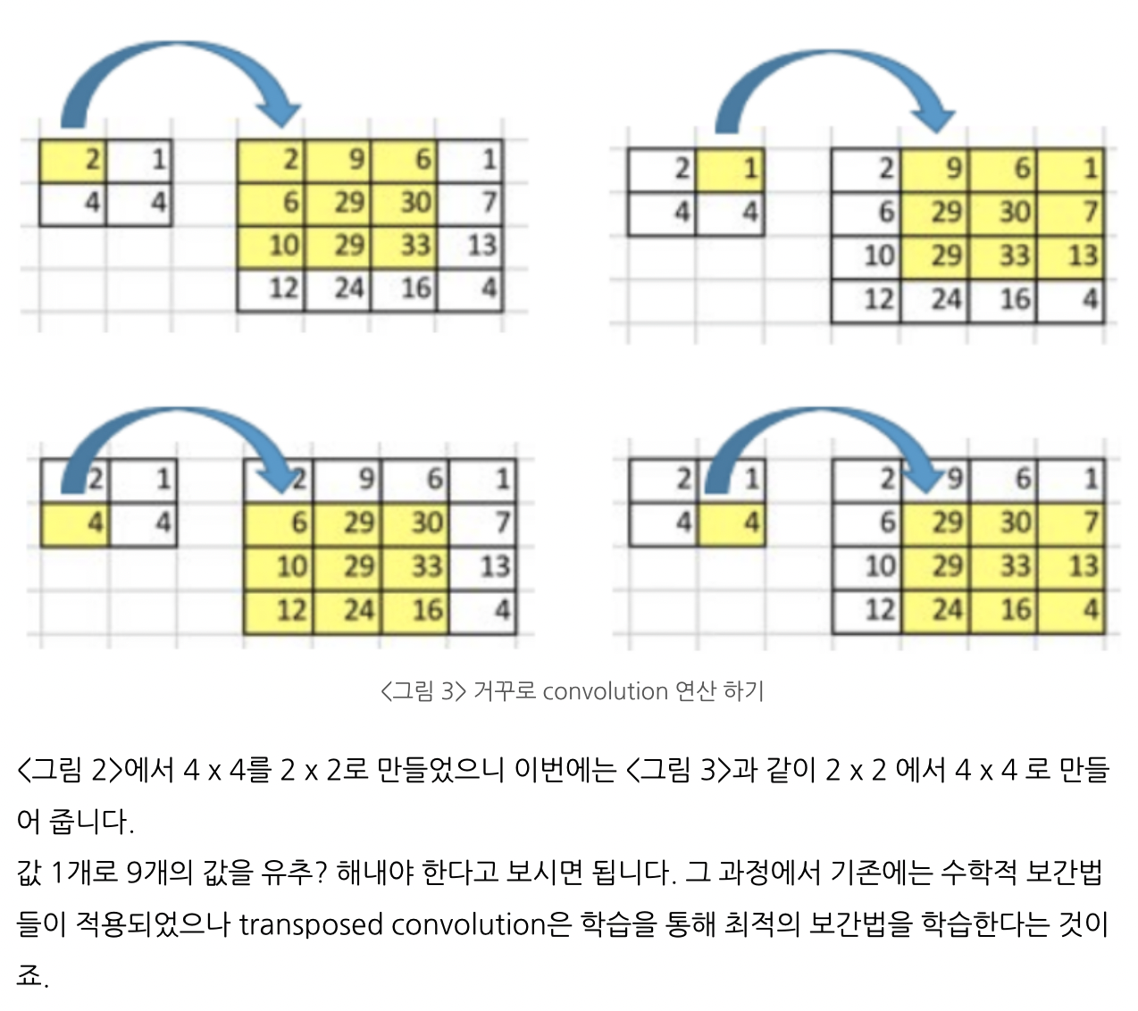 transposed convolution은 학습 가능한 upsampling을 하나의 layer로 한방에 처리했다면