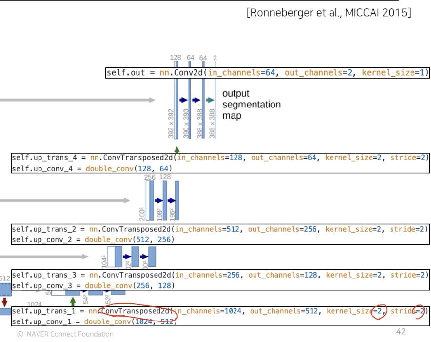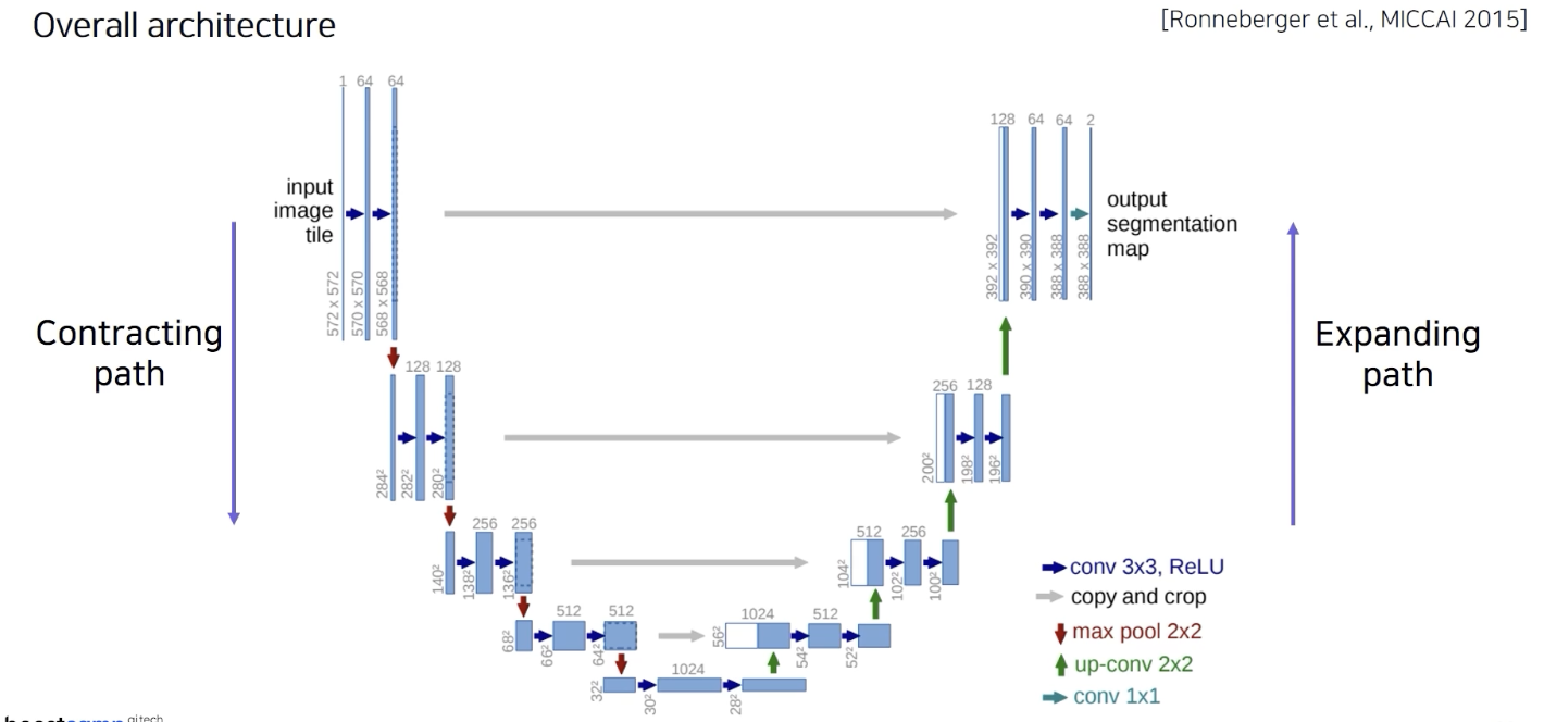 이때 activation map의 해상도와 채널사이즈는 contracting part에서 오는 대칭으로 대응되는 레이어와 맞춰서 낮은 층의 있었던 activation map 을 사용할 수 있도록 디자인