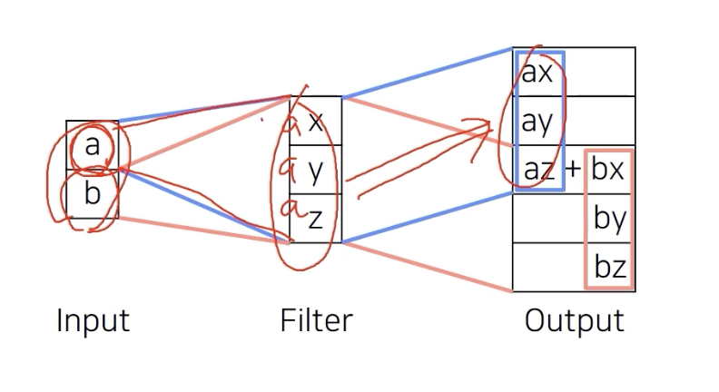 a,b 두개의 입력이 주어졌을 때, transpose convolution은 filter 를 scaling 한 것을 해당하는 출력 위치에 붙여 넣는다.