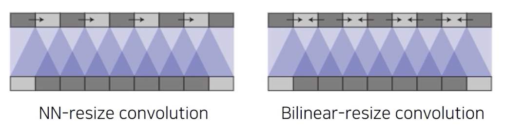upsampling convolution은 upsampling operation 을 두개로 분리해서 간단한 영상 처리 operation 으로 많이 사용되는 interpolation들을(Nearest neighbor (NN), Bilinear) 먼저 적용을 한다. 여기에는 어떤 학습가능한 파라미터는 없고 그저 해상도만 좀 키웠는데, 학습 가능한 learnable upsampling 으로 만들기 위해서 convoluion을(n X n Conv) 적용해준다.