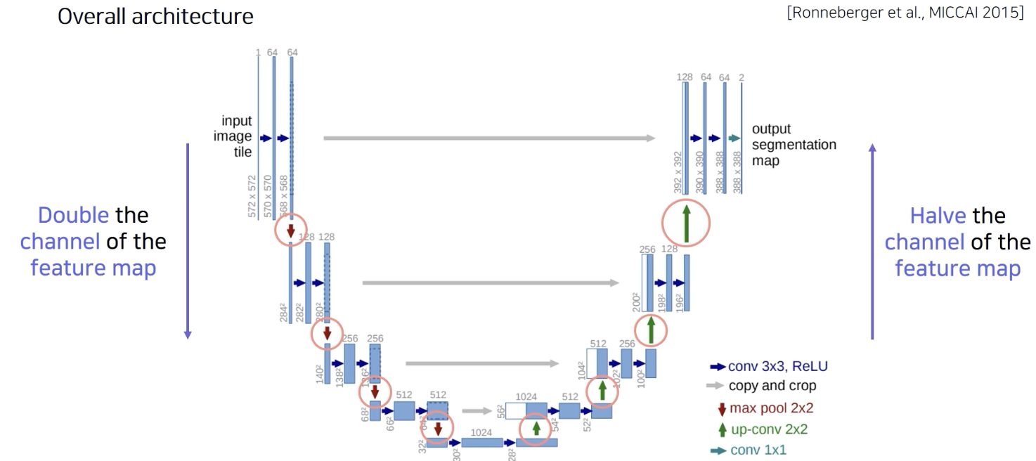 activation map 을 두배씩 줄였다가 두배씩 키우고, channel은 반대로 두배씩 키웠다가 2배씩 줄이도록 설계되어있다.