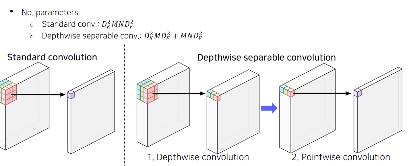 이를 통해 conv 의 표현력도 어느정도 유지가 되면서 계산량은 획기적으로 줄어든다. (상단 이미지의 계산량 참고)