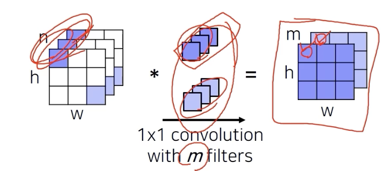 1 by 1 conv 를 통해서 하나의 값이 출력이 되도록 합쳐준다.