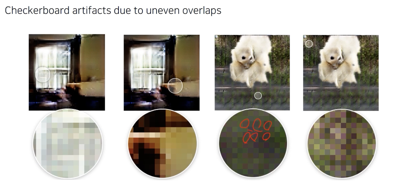 2로 한칸씩 뛰면서 2칸씩 채워넣는 식으로 upsampling을 하여 중첩되는 부분이 안생긴다. (체커보드 X)