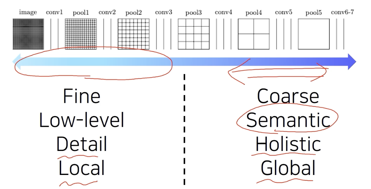 Sementic segmentation은 두 정보가 모두 필요하다. 각 pixel 별로 의미를 파악해야 하고, 영상 전체를 바라보면서 현재 pixel이 물체의 경계선 안쪽에 해당하는지 바깥쪽에 해당하는지 경계부분을 detail하게 파악해야 한다.