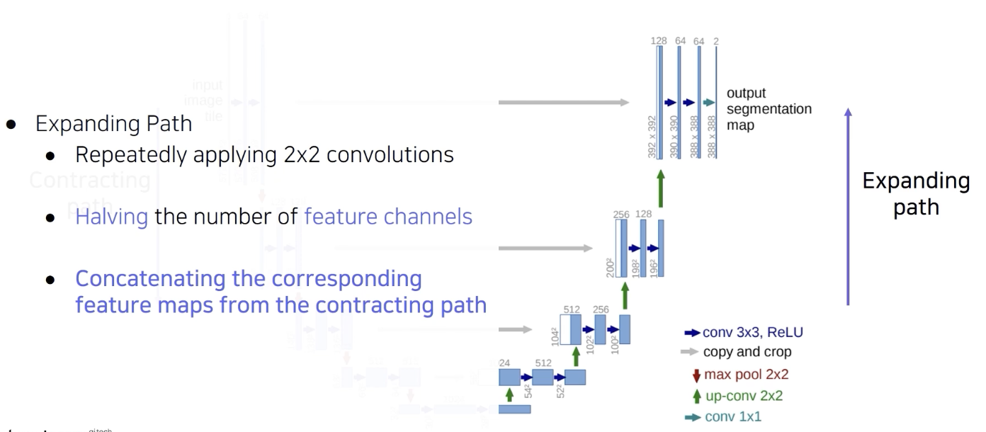 upsampling 경로를 expanding path 라 한다. 해상도를 점진적으로 늘리면서 대칭되는 특징들을 skip conncetion을 통해서 fusion을 한다.