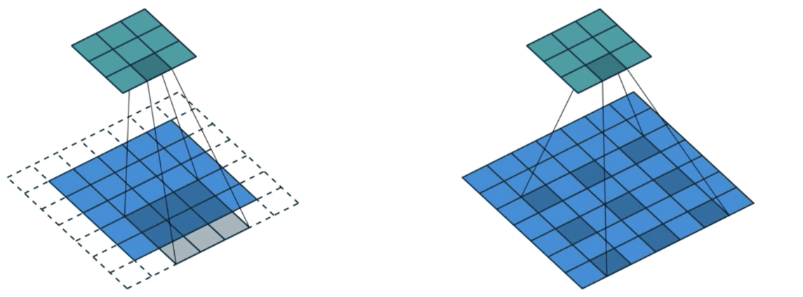 dilated convolution 은 왼쪽과 달리 실제 Conv kernel 보다 더 넓은 영역을 고려할 수 있도록 하고 다만 파라미터 수는 늘어나지 않는다.