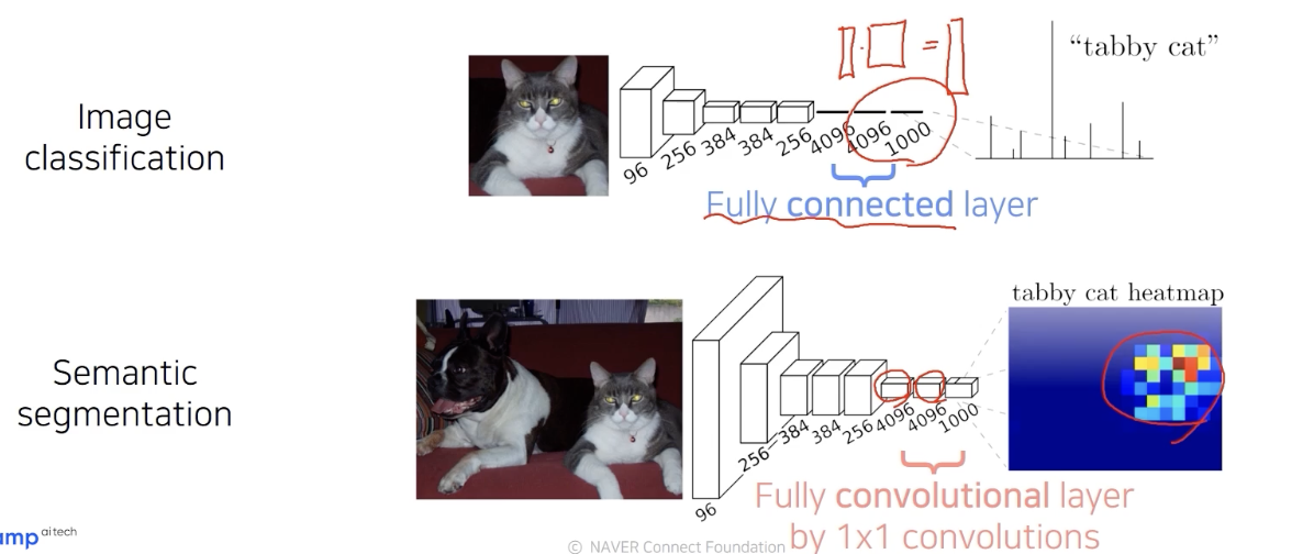 기존의 FC layer 를 1by1 convolution으로 대체만 하면 sementic segmenation을 수행할 수 있다.