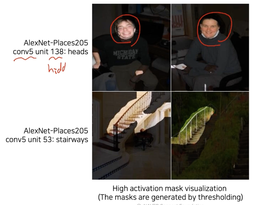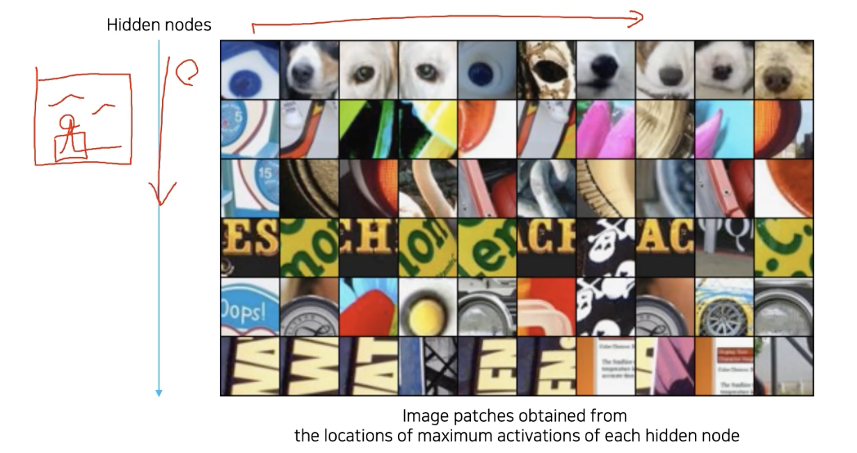 (세로축은 서로 다른 hidden 노드 )그 결과, 아 이 히든노드는 강아지 눈, 혹은 이 히든 노드는 뭐 굴곡진거 등 이런걸 찾는 detector구나 하고 알 수 있다.