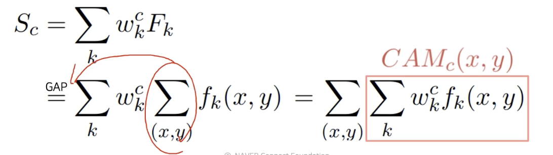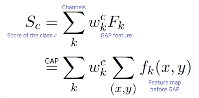 $w_k^c \, F_k$: 마지막 layer 에 해당하는 weight 와 마지막의 gap(global average pooling) feature 즉 각각 공간축의 평균값을 내서 하나의 node로 만든 feature들의 linear combination으로 score가 만들어졌다. 각각의 feature vector 들의 element의 w 가 linear combination 으로 곱해져서 최종적으로 score를 만든다.