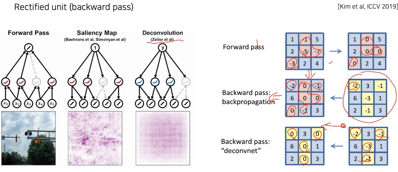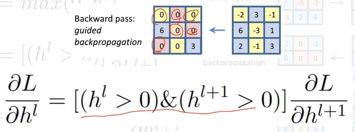 deconvnet: 그냥 backward 할 때 음수 값 0으로 마스크 오른쪽 사진은 해당 수식