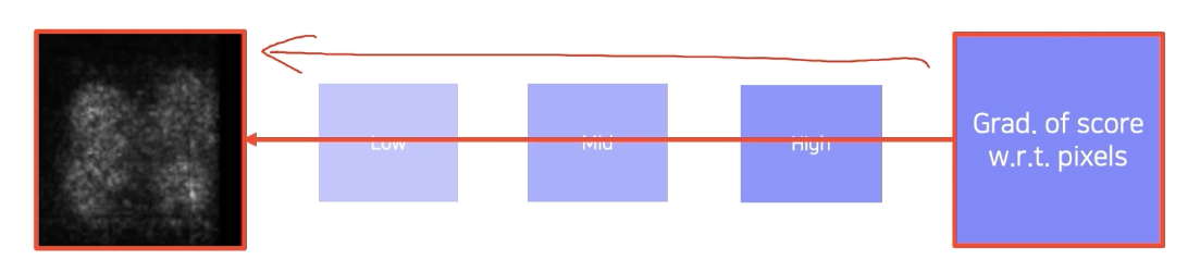 3) oss를 변경해주는 gradient를 얻고, 얻은 gradient에 절대 값 혹은 제곱을 통해 절대적인 크기를 구해서 해당 이미지 형태로 출력을 한다. 절대값 제곱은 graident 크기 자체가 중요한 정보로, 많이 바뀌어야 score변하므로 부호보다는 그 절대 적인 크기를 중요하게 생각해서 절대값이나 제곱을 취하고 magnitude를 구해서 visualization을 구한다.