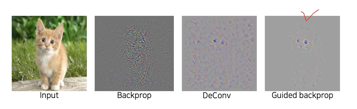 결론적으로 guided backprop 은 양 방향에서 검출에 도움이 되는 부분만 골라서 뽑은 것이다.