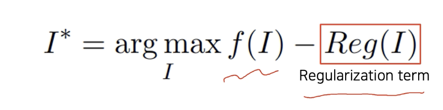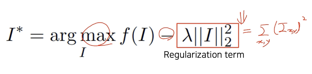 혹은 normalize되면 0 ~ 1 사이 값으로 bound 된 형태로 표현을 하게 되는데, 그말은 최적화 과정을 거쳐서 나온 출력 I 가 너무 큰 값으로 나오면 해석 가능한 형태가 아닐 수 있다. 그러나 CNN 은 그 경우를 해당 클래스로 분류를 잘하면 문제가 된다. 그걸 막고, 우리가 알고 있는 이해할 수 있는 영상을 유도하기 위해서 간단한 loss인 regularization term 을 추가한다.