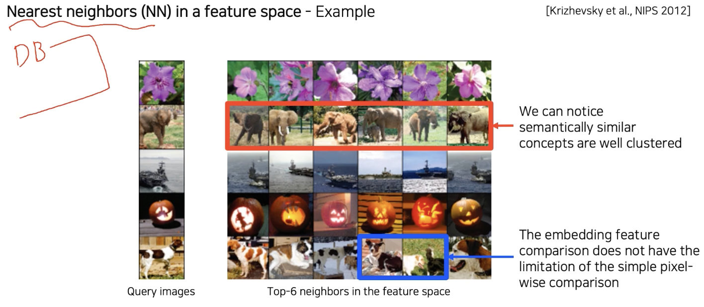 다음과 같이 query image 의 특징을 추출해서 feature space에서 위치해주면 해당 위치와 가까운 영상들을 찾은 후 어떤 것인지 분석할 수 있다. (feature로 오리지날 데이터를 가져와서 보여줄 수 있다.)