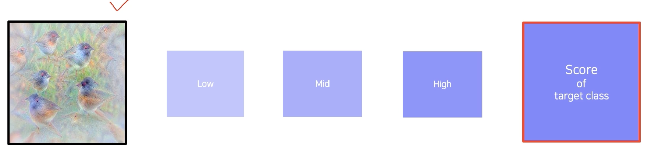 그후 backpropagation 을 쭉해서 입력까지 내려가서, 입력이 어떻게 변해야 target score가 높아지는지 찾고, 이에 따라 input image를 업데이트 한다. (gradeint를 더해준다.)