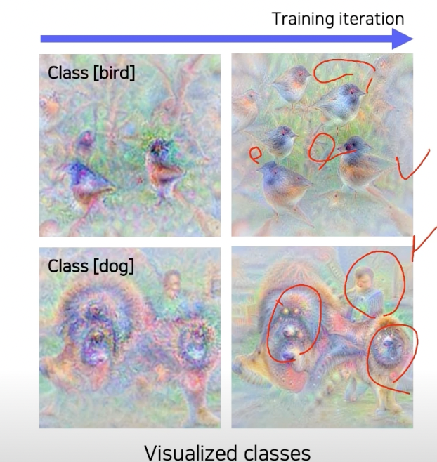 즉 초기 입력을 어떻게 설정하냐에 따라 다양한 결과를 얻어볼 수 있다. 이 neural net 을 하나의 class에 대해서 어떤 이미지를 상상하고 있는지는 여러번 이 관점을 거쳐서 다양한 영상을 만들어 놓고 패턴들을 쭉 늘여놓고 눈으로 관찰하며 분석해볼 수 있다.