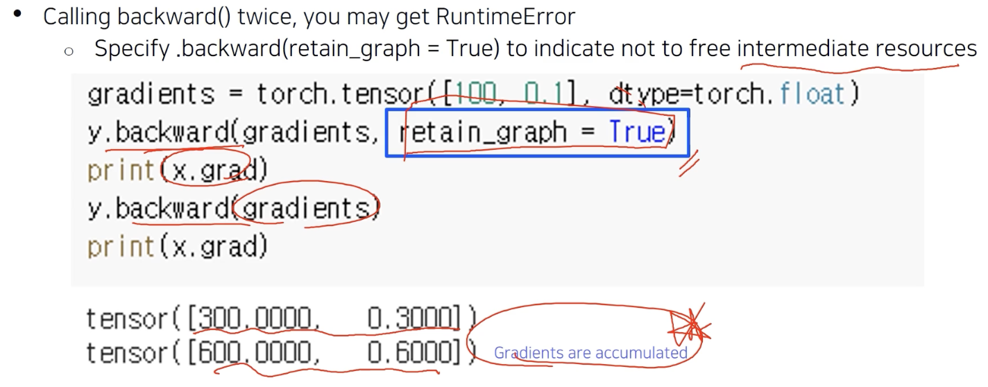 backward 를 두번 호출하면 두번의 미분 값이 중첩된다.