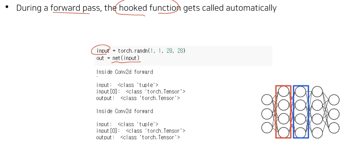 여기서 hook은 backward 가 call 될 때 backward 중간에 있는 정보를 꺼내오는, 낚아채는 역할이다.