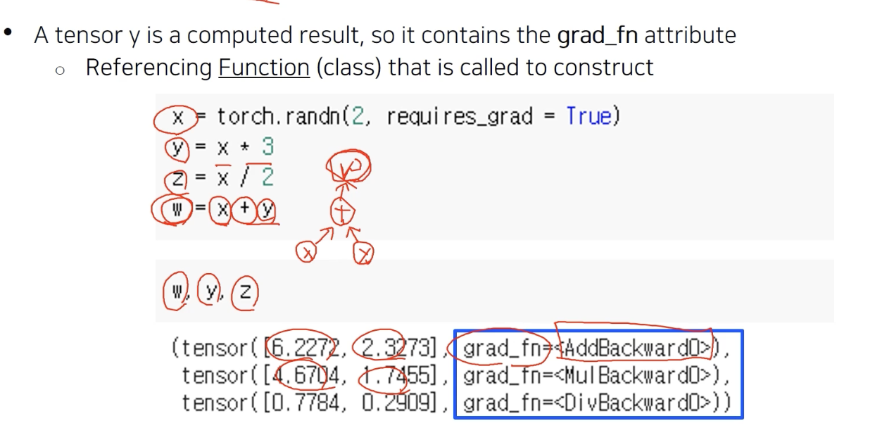 w,y,z를 출력해보자. w 의 경우 grad_fn = AddBackward0