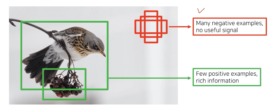 positive sample 은 적은 반면, negative sample은 정보도 없으면서 엄청난 영역과 개수로 class imbalance 문제가 있다.