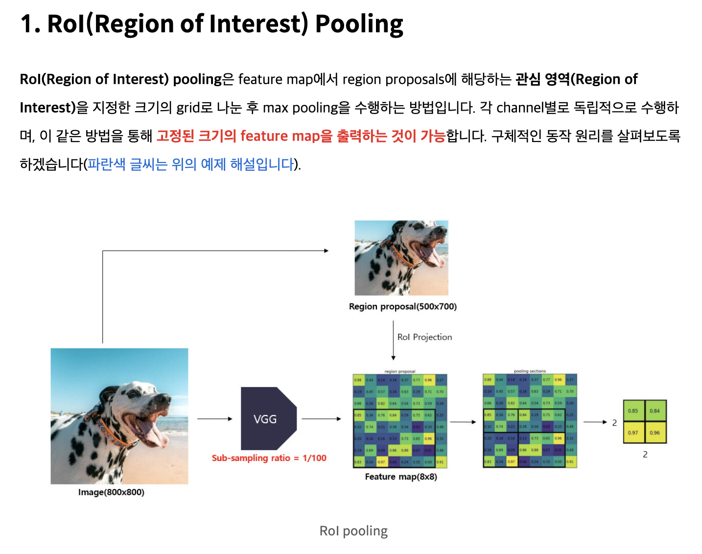 이처럼 미리 지정한 크기의 sub-window에서 max pooling을 수행하다보니 region proposal의 크기가 서로 달라도 고정된 크기의 feature map을 얻을 수 있다.