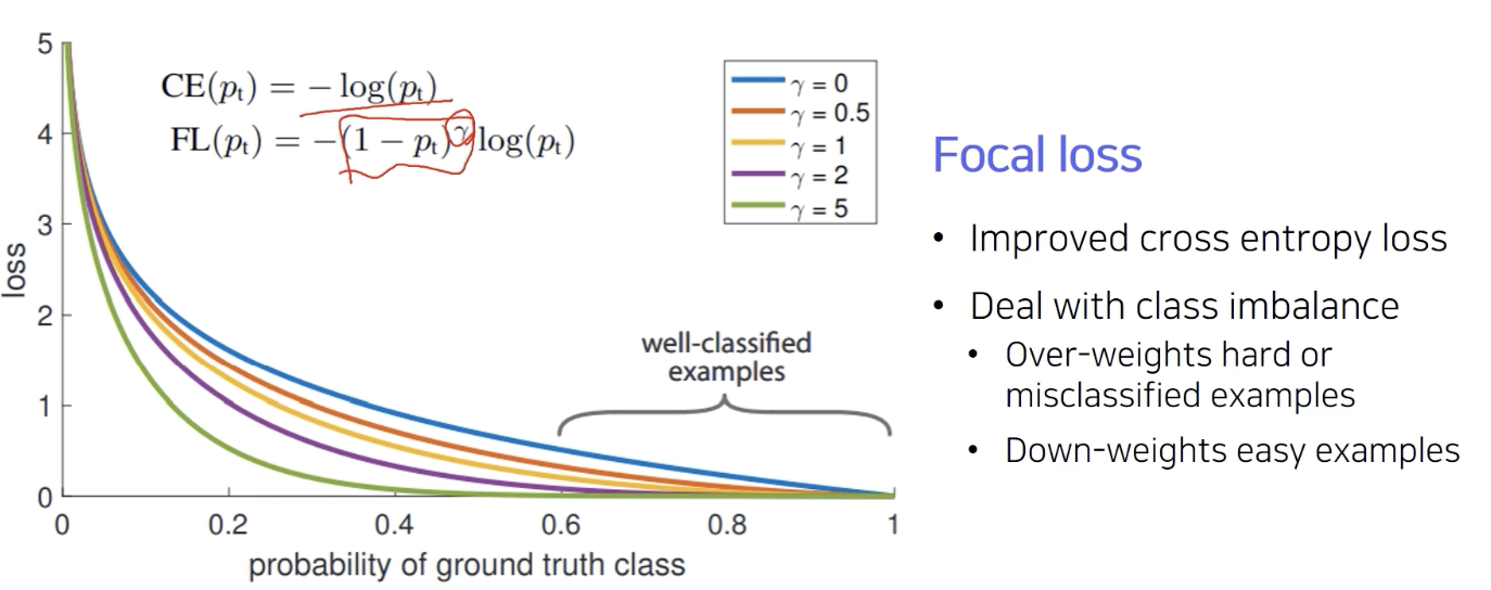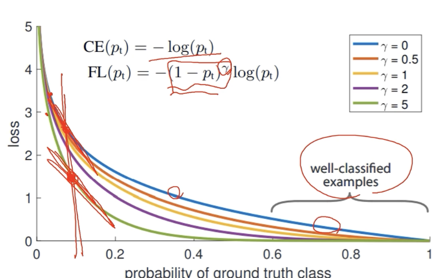 Focal loss는 앞에 확률 term을 붙여줘서, 잘 맞춘 애들은 더 loss를 낮게 만들고, 못 맞추면 더 sharp 한 loss를 준다.
