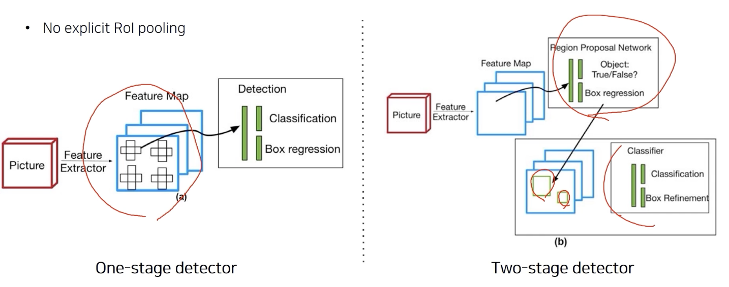 Region proposal 을 기반으로한 ROI pooling을 사용하지 않고 바로 box regression과 classification을 수행하여 구조가 간단하고 빠르다.
